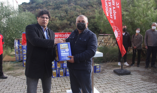 MUĞLA (AA) - Muğla'nın Datça ilçesinde orman yangınından etkilenen bal üreticilerine, Tarım ve Orman Bakanlığınca gönderilen arı yemi hibe edildi.