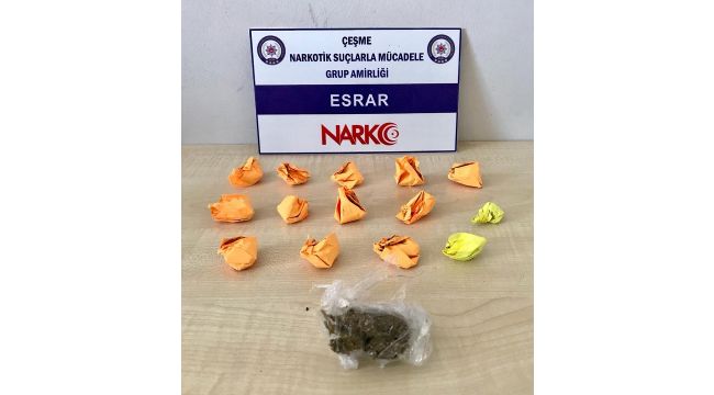 İZMİR (İHA) - İzmir'in Çeşme ilçesinde, uyuşturucu satıcılarına karşı yoğun bir mücadele yürüten polis ekipleri, satışa hazır 15 paket esrar maddesi ele geçirdi.