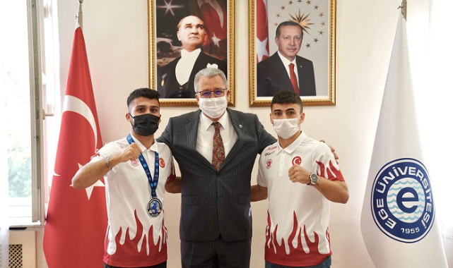 Ege Üniversitesi Rektörü Prof. Dr. Necdet Budak, İtalya’da düzenlenen Büyükler Dünya Kick Boks Şampiyonası’ndan madalyayla dönen Ege Üniversitesi Spor Bilimleri Fakültesi öğrencileri Ali Ataberk Gürbüzcan ve Ali Koyuncu’yu makamında ağırladı.