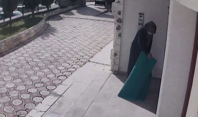 Karabük’te kimliği belirsiz bir kadın, elinde ekmek poşetiyle geldiği site içerisindeki apartmanın önünde bulunan paspası çaldığı anlar güvenlik kamerasına yansıdı.
