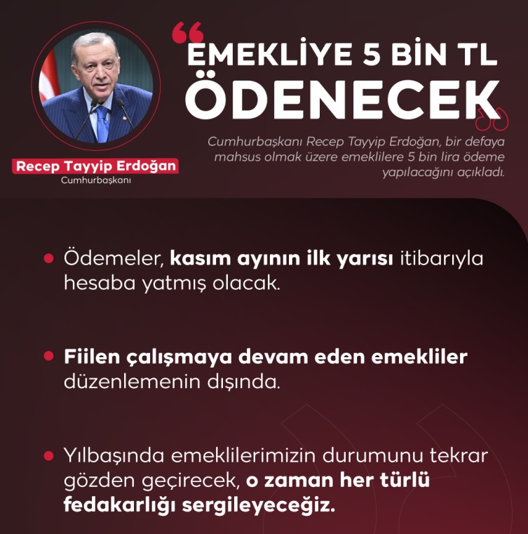 Cumhurbaşkanı Recep Tayyip Erdoğan, emeklilere bir defaya mahsus olmak üzere 5 bin lira ödeme yapılacağını, fiilen çalışmaya devam edenlerin kapsam dışı olduğunu açıkladı. Ödemeler, kasım ayının ilk yarısı itibarıyla emeklilerin hesabına yatırılmış olacak.