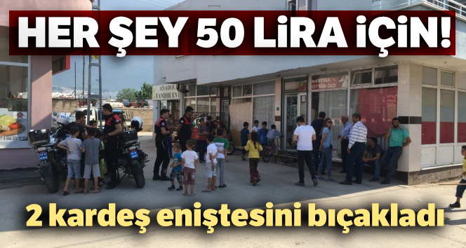 Bursa'da aralarında 50 liralık alacak verecek meselesi olan 2 kardeş eniştelerini bıçakladı. Olayda bıçaklanan enişte saatlerce polisten kaçarken ilaç almaya gittiği eczanenin ihbarı üzerine yakalandı, 2 şüpheliden biri ise halen aranıyor.
