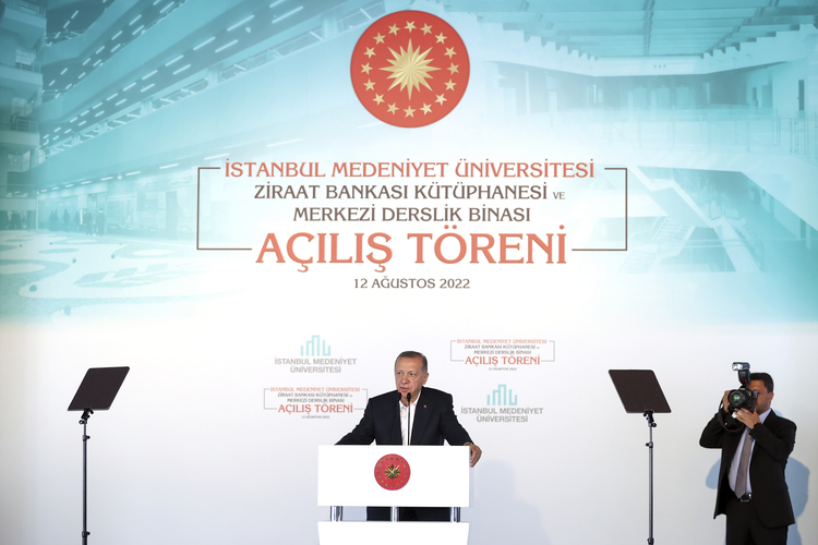 Cumhurbaşkanı Recep Tayyip Erdoğan, İstanbul Medeniyet Üniversitesi Ziraat Bankası Kütüphanesi ve Merkezi Derslik Binası açılışında yaptığı konuşmada, kurulduğu 2010 yılından bugüne hızla gelişen, büyüyen, ülke içinde ve dışında iftiharla bahsedilen başarılara imza atan üniversiteyi yakından takip ettiklerini belirtti.Rektörü ve hocaları, "Üniversite medeniyettir" ifadesini hayata geçirmek amacıyla samimiyetle çalıştıkları için tebrik ettiğini söyleyen Erdoğan, "İnşallah yeni kayıt dönemiyle beraber 15 bini bulacak öğrencileriyle üniversitemiz, ülkemizin en seçkin yükseköğretim kurumları arasındaki yerini daha da güçlendirecektir. Bugün İstanbul Medeniyet Üniversitemize, marka değerinin önemli katkı sağlayacağına inandığım yeni bir eseri daha öğrencilerimizin ve hocalarımızın hizmetine sunmak için buradayız. Evet Ziraat Bankamızın desteğiyle tamamlanan kütüphanemizin, merkezi derslik binasının üniversitemize, şehrimize ve ülkemize hayırlı olmasını diliyorum." dedi.Ziraat Bankasının genel müdürüne, yönetim kuruluna ve eserin ortaya çıkmasında emeği geçen herkese milleti adına teşekkür ettiğini kaydeden Cumhurbaşkanı Erdoğan, şöyle devam etti:"Temelini de bizzat attığımız bu eserin açılışını yapmayı nasip ettiği için Rabb'ime hamdediyorum. Bünyesindeki 1 milyon cilt basılı kitabı ve aynı anda 3 bin kişiye hizmet verecek fiziki büyüklüğüyle ülkemizin en büyük üniversite kütüphanesini açıyoruz. Biliyorsunuz halihazırda ülkemizin en büyük kütüphanesi Ankara'daki Beştepe Cumhurbaşkanlığı Külliyesi içinde yer alan hedef 5 milyon ciltlik kitap kapasitesine sahip millet kütüphanesidir. Burasının da millet kütüphanesi gibi haftanın her günü 24 saat açık olacağını, kullanıcılara her türlü imkanın sağlanacağını, ikramların yapılacağını öğrenmekten memnuniyet duyduk."Cumhurbaşkanı Erdoğan, öğrencilerden kütüphanedeki çay, kek gibi ürünler için ücret alınmayacağını, üniversitenin Rektörü Prof. Dr. Gülfettin Çelik'e sorarak onaylattı.
