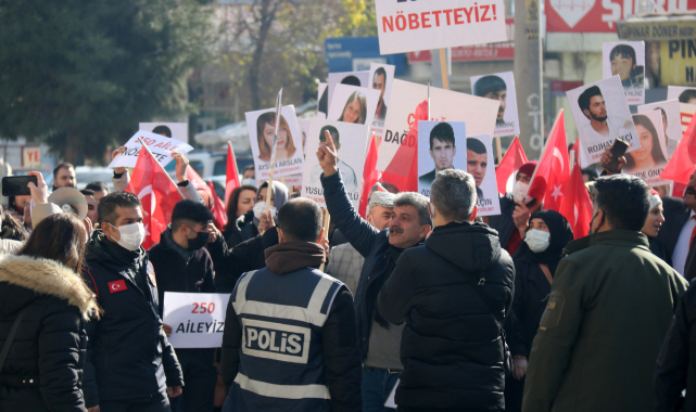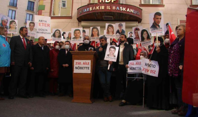 Aileler, teröre lanet yürüyüşü düzenledi. Çocuklarının terör örgütü PKK mensupları tarafından dağa kaçırıldığı iddiasıyla 3 Eylül 2019'dan bu yana farklı kentlerden Diyarbakır'a gelerek HDP il binası önünde oturma eylemi yapan aile nöbeti 848'inci gününde de devam ediyor. Ailelerin sayısı çığ gibi büyürken Hakkari'den gelen aile ile birlikte sayı 250'ye yükseldi. Aileler, 250'inci aile birlikte terör yürüyüşü düzenledi.Hakkari'de 2015 yılında henüz 23 yaşındayken terör yandaşları tarafından PKK'ya katılımı sağlandığı öne sürülen Nurettin Timur'un ağabeyi Adil Timur, gece saatlerinde Diyarbakır'a gelerek aileler tarafından otogarda karşılandı. Covid 19 kontrolleri yapılan Timur, daha sonra HDP İl Başkanlığı önüne gelerek diğer ailelere dahil oldu.Timur, kardeşinin 2015'de PKK'ya katıldığını söyledi. O günden beri kardeşinden haber alamadığını ileri süren Timur, “Kardeşim gelene kadar bende burada kalacağım. Onu almadan buradan gitmeyeceğim. Bizi görüyorsa, duyuyorsa gelip güvenlik güçlerine teslim olsun. Sıcak yuvana kavuşsun. Annem vefat ettikten sonra yaklaşık bir yıl sonra kayboldu. Ondan sonra haber alamadık” dedi.Timur, basın açıklamasının ardından diğer ailelerle birlikte ‘teröre lanet' yürüyüşüne katıldı. Aileler, “Kahrolsun PKK, kahrolsun HDP”, “Otura otura kazanacağız” sloganları atarak yürüyüş gerçekleştirdi Ailelerin yürüyüşüne ziyarete gelen AK Parti Bağlar Belediye Başkanı Hüseyin Beyoğlu da eşlik etti.