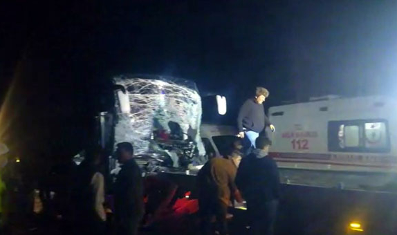 Kaza, dün gece Afyonkarahisar’ın Sandıklı ilçesi Organize Sanayi Bölgesi yakınlarında meydana geldi. Edinilen bilgilere göre, Salih Ç, idaresindeki 34 VIB 50 plakalı tur otobüsü, Ahmet E.’nin kullandığı 03 ACV 414 plakalı TIR’a arkadan çarptı. Çarpmanın etkisiyle otobüste ağır hasar meydana gelirken, 1’i ağır 12 kişi yaralandı. Yaralılar olay yerine gelen 112 Acil servis ekipleri tarafından ambulanslar ile hastanelere kaldırıldı. Yaralılardan bacağı kopan ve durumu ciddi olan otobüsün yardımcı şoförü Nurbay Irmak (44) kaldırıldığı hastanede müdahalelere rağmen kurtarılmayarak hayatını kaybetti. Öte yandan, kazada yaralanan ve hastaneye kaldırılan diğer yaralıların ise 7’sinin taburcu edildiği, 4’nün ise tedavilerinin devam ettiği bildirildi. Kazanın ardından başlatılan soruşturmanın sürdüğü bildirildi. (İHA)