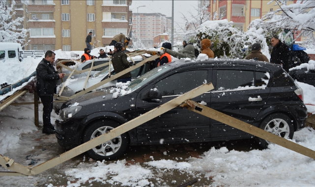 Gaziantep'in İslahiye ilçesinde, yoğun kar yağışı nedeniyle tahta terasın çökmesi sonucu park halindeki 14 araçta hasar oluştu.