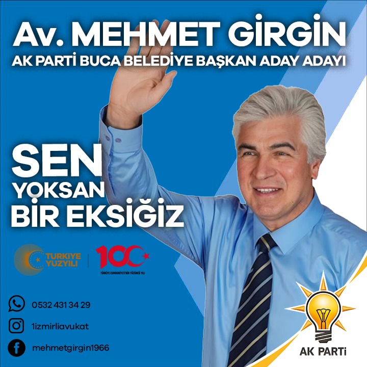 AK Partinin kuruluşundan bu yana aktif siyasetin içinde yer alan, Mehmet Girgin, Ak Parti buca Belediye Başkan Aday Adayı oldu. Siyasete başladığı Buca İlçesinde 2004-2009 Yılları arasında Buca ve İzmir Büyükşehir Belediye Meclis Üyeliği yapan tecrübeli hukukçu, aynı zamanda Ak Parti Buca ve İBB Grup Sözcüsü olarak görev aldı. AK Partinin kurulduğu ilk günden bugüne kadar partinin her kademesinde görev yapan Girgin; 7 yıl AK Parti İl Başkan Yardımcılığı görevinin yanı sıra, Seçim İşleri Başkan Yardımcısı olarak ta aktif olarak siyasi çalışmalarda bulundu.