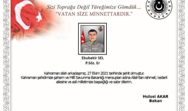 Bakanlıktan yapılan açıklamada, "Hakkari'de meydana gelen askeri araç kazasında Piyade Sözleşmeli Er Ebubekir Sel şehit olmuştur. Bizleri derin bir acı ve üzüntüye boğan bu olayda hayatını kaybeden aziz şehidimize Allah'tan rahmet, kederli ailesine, Türk Silahlı Kuvvetleri ile asil milletimize başsağlığı ve sabır dileriz." ifadelerine yer verildi.