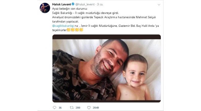 Haluk Levent sosyal medyadan yaptığı paylaşımda, “Sağlık Bakanlığı ve İl Sağlık Müdürlüğü devreye girdi. Ameliyat önümüzdeki günlerde Tepecik Eğitim ve Araştırma Hastanesinde Mehmet Selçuk tarafından yapılacak. Sağlık Bakanlığına, İzmir İl Sağlık Müdürlüğüne ve Gaziemir Belediye Başkanı Halil Arda’ya teşekkürler” ifadelerine yer verdi.