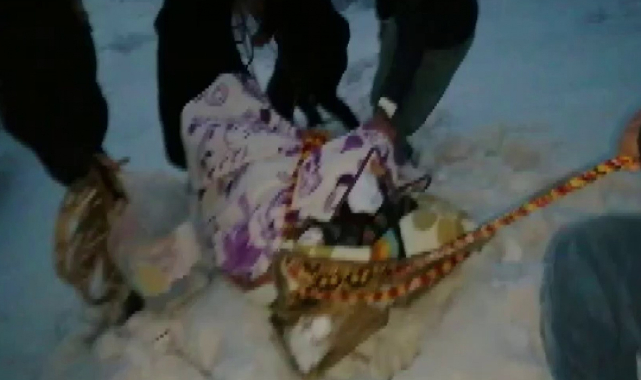 Kar kalınlığının 2 metreyi geçtiği Adıyaman’ın Sincik ilçesi Sakız köyü hayırlı mezrasındaki yaşlı hasta, ambulansa tahtadan yapılan kızakta taşındı.