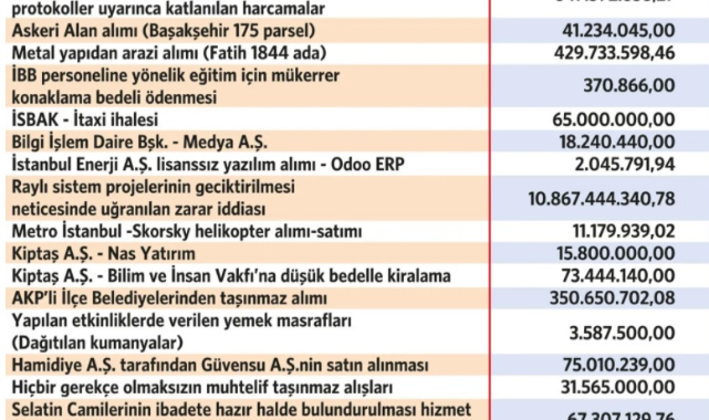 13 milyar 202 milyon liralık bir kamu zararı olduğu belirlendi. İçişleri Bakanlığı bu dosyalara el koydu. Ne oldu bu dosyalar?” dediği dosyaları yazdı.Sözcü yazarının bugünkü köşesinde aktardıkları şöyle:– İstanbul Enerji Sanayi ve Ticaret A.Ş.nin satın aldığı yazılımlar için yaptığı ödemeler çerçevede, yapılan iş ve işlemlerin yerindeliğinin tespiti ile varsa oluşmuş bulunan kamu zararının ve buna sebep olanların ortaya konulması çalışmaları devam ederken iş devredilmiştir.– Büyükşehir Belediyemiz Raylı Sistem Daire Başkanlığı tarafından Teftiş Kurulu Başkanlığımıza iletilen, raylı sistem yapım iş ve işlemlerinde yanlış kararlardan dolayı kamunun yaklaşık 11 milyar Türk Lirası zarar etmesi iddialarının incelenmesi için ‘Başkanlık Oluru’ alınmış, ancak iş devralınmıştır.– Metro İstanbul Sanayi Ve Ticaret A.Ş. tarafından 590.000,00 ABD Dolarına satın alınan 1988 model SIKORSKY S-76B tipi helikopter 2019 tarihinde KDV dahil 601.800,00 TL’ye satılmıştır. Kiralama hizmetinden toplamda 3.220.401,21 TL gelir etmesine karşın 14.400.340,23 TL gidere katlanmış, helikopter kiralama hizmeti verilmeyen 2018 yılında yalnızca personel ücret gideri olarak 919.589,80 TL ödemede bulunmuştur. Helikopterin yerinde kullanılmış olup olmadığı incelenirken iş devralınmıştır. – Kağıthane’de “Kentsel Dönüşüm Projesi” kapsamında Kiptaş ile Nas Yatırım Gayrimenkul arasında 19.03.2018 tarihinde “Taşınmaz Satış Vaadi ve Arsa Malikleri ile İmzalanmış Sözleşmelerdeki Tüm Hakların Devrine Dair Sözleşme” imzalandıktan iki gün sonra Nas firmasına yükümlülüklerini yerine getirmeden ödeme yapılmıştır. Konunun tüm yönleriyle incelenip soruşturulması için ‘Başkanlık Oluru’ alınmış, ancak iş devralınmıştır.– Çamlık Mahallesi’nde yer alan öğrenci yurdu binalarının Kiptaş tarafından Bilim ve İnsan Vakfı’na 49 yıllığına yapılan tahsis işleminin yasal dayanağının olmadığı, anılan şirketin hali hazırda aylık 124.905,00 TL’lik kira gelirinden mahrum kalındığı işlemlerinin incelenip soruşturulması için ‘Başkanlık Oluru’ alınmış, ancak iş devralınmıştır. – İstanbul Sanat ve Meslek Eğitimi Kursları ve Seminerleri (ÎSMEK) Hizmet Alımı İşi’ne ilişkin iş ve işlemlerin tüm yönleri ile incelenip araştırılması hakkında Müfettiş görevlendirmesi yapılmış olup, çalışmalar devam ederken iş devralınmıştır.– Sarıyer ilçesi Çamlıtepe (Derbent) Mahallesindeki Gecekonduların Dönüşümü’ne ilişkin çalışma ile ilgili Belediye Başkanlığımız, S.S. Oto Sanatkârları Konut Yapı Kooperatifi ve Cemre inşaat Turizm San ve Tic. A.Ş. arasında imzalanan protokol çerçevesindeki iş ve işlemlerin incelenmesi çalışmaları devam ederken iş devralınmıştır. – Kamu kaynaklarının siyasi çalışmalar için kullanılmış olabileceği ve bunun gizlenmesi için içerik itibariyle sahte belge üretildiği kanısı oluşmuştur. Bu çerçevede, Beltur şirketinin yaptığı tüm etkinliklerin, bu etkinliklerin hangi kişi ve kurumlar adına düzenlediğinin, İBB ve İBB’nin şirketleri adına düzenlenmiş gibi gözüken etkinliklerin gerçekleşip gerçekleşmediğinin, yapılmış gibi gözüken etkinlikler nedeniyle yapılan giderlerin başka bir amaçla kullanılıp kullanılmadığının tespiti çalışması devam ederken iş devralınmıştır. – Hamidiye Kaynak Suları San. Tur. Tic. A.Ş. tarafından Güven Su San. ve Tic. A.Ş.’nin hisselerinin tamamının Hisse Devri Protokolüyle kuvvetli suç şüphesinin varlığını ortaya koyduğu ve konunun savcılığa intikal ettirilme aşamasında Mülkiye müfettişlerine intikal ettirilmiştir.– Fatih’te Fatih İlim ve Kültür Vakfına ait taşınmazların Büyükşehir Belediyemizce neden alındığı hakkında Müfettiş görevlendirmesi yapılmış olup, çalışmalar devam ederken iş devralınmıştır.– Esenler’de 1.913 m2’lik yeşil alanın Büyükşehir Belediyemizce maliki Müslüm Duras’tan 6.150.000 TL’ye neden alındığı hakkında müfettiş görevlendirmesi yapılmış olup, çalışmalar devam ederken iş devralınmıştır. (Müslüm Duras, Esenler İBB AKP Meclis Üyesi İlyas Duran’ın babası)– Avcılar’da 664 m2’lik Türkiye İlmi ve İctimai Hizmetler Vakfı’na ait riskli binanın 5.700.000,00 TL’ye neden alındığı hakkında müfettiş görevlendirmesi yapılmış olup, çalışmalar devam ederken iş devralınmıştır. (Hizmet protokolü çerçevesinde Aziz Mahmut Hüdayi Vakfı’na verilmek istenmiş ancak, riskli yapı olduğu için alındıktan sonra kullanılmadan yıkılmıştır.)– Büyükçekmece’de 1.705 m2’lik ilköğretim tesis alanının Büyükşehir Belediyemizce hangi gerekçe ile alındığı, Emlak Müdürlüğümüzün değerlemesine göre 2.558.550,00 TL olabilecek yerin 3.650.000,00 TL’ye alınma gerekçesine ilişkin araştırma yapılırken iş devralınmıştır.– Bayrampaşa’da 898 m2’lik maliki Süleyman Sancak’ın taşınmazı 2.500.000,00 TL’ye neden kamulaştırıldığı hakkında müfettiş görevlendirmesi yapılmış olup, çalışmalar devam ederken iş devralınmıştır.– Fatih’te konut alanı planlı 210 m2’lik dükkan 3.200.000 TL ödenerek neden alındığı hakkında Müfettiş görevlendirmesi yapılmış olup, çalışmalar devam ederken iş devralınmıştır. (Alınan dükkan Sıcak Yuva Vakfı’nın tam altında yer alıyor.)– İtfaiye araçlarının alım süreci incelenirken iş devralınmıştır.– İGDAŞ’ın “3 Boyutlu Uygulama Geliştirme İyileştirme Hizmeti Alımı Sözleşmesi”nin incelenip araştırılması hakkında müfettiş görevlendirmesi yapılmış olup, çalışmalar devam ederken iş devralınmıştır.– Tuzla Belediyesi mü