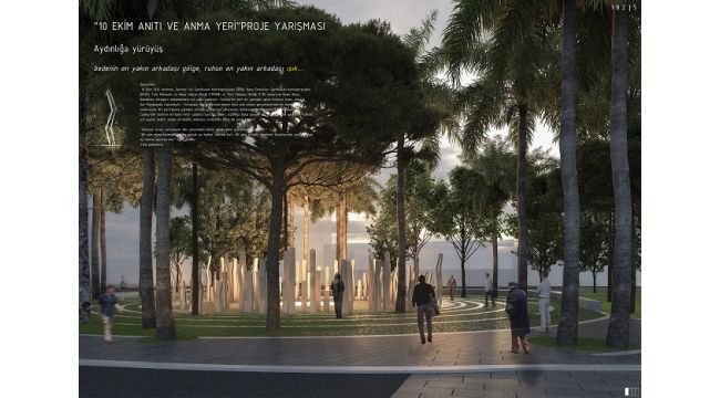 Üç aşamalı bir değerlendirme sonucunda birinci seçilen proje, 10 Ekim’in unutulmamasını, hayatını kaybetmiş ya da hayatta kalan bireylerin anısını onurlandırmayı, bir anımsama, anımsatma ve anma mekânının kente kazandırılmasını amaçlıyor. Alsancak’ta Atatürk Caddesi ile Liman Caddesi’nin kesiştiği yerde bulunan Asteğmen Besim Bey Parkı’nda uygulanacak proje, alanın emek, demokrasi ve barışa adanarak yurttaşların bir araya geleceği bir kamusal mekân olarak yeniden üretimini hedefliyor.