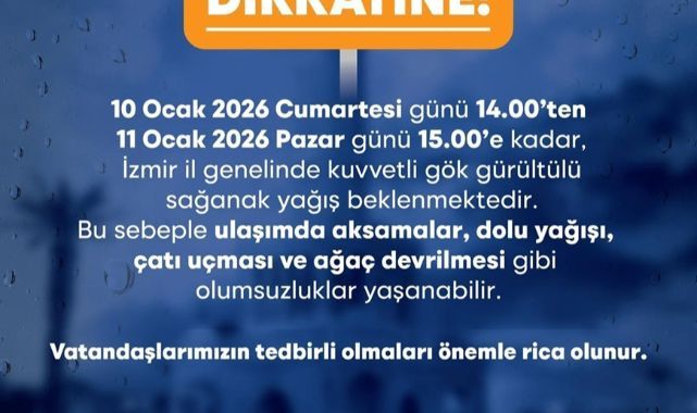 Meteorolojik uyarı kapsamında 10 Ocak Cumartesi saat 14.00’ten 11 Ocak Pazar saat 15.00’e kadar, İzmir genelinde kuvvetli gök gürültülü sağanak yağış bekleniyor. Bu süreçte ulaşımda aksamalar, dolu yağışı, çatı uçması ve ağaç devrilmesi gibi olumsuzluklar yaşanabilir. Kentin olası olumsuzluklardan en az etkilenmesi için hazırlıklarımızı yapıyoruz, sahada görevli ekiplerimizle teyakkuz hâlindeyiz. Vatandaşlarımızın mağduriyet yaşamaması adına dikkatli ve tedbirli olmalarını önemle rica ederiz.10 Ocak 2026 Cumartesi günü 14.00'ten 11 Ocak 2026 Pazar günü 15.00'e kadar, İzmir il genelinde kuvvetli gök gürültülü sağanak yağış beklenmektedir.Bu sebeple ulaşımda aksamalar, dolu yağışı, çatı uçması ve ağaç devrilmesi gibi olumsuzluklar yaşanabilir.Vatandaşlarımızın tedbirli olmaları önemle rica olunur.Acil durumlar için: ALO 153 Hemşehri İletişim Merkezi.