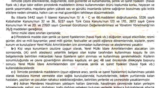 İzmir Valiliği tarafından yapılan açıklamaya göre, kent genelinde çeşitli etkinliklerde, düğünlerde, dini ve milli bayramlarda, yerel milli günler, festivaller ve çeşitli eğlence dönemlerinde kişilerin, resmi kurum ve kuruluşların izinsiz havai fişek kullanamayacağı belirtildi. İzmir Valiliği tarafından yapılan açıklamaya göre, ilimizde çeşitli etkinliklerde, düğünlerde, özel günlerde ve kutlamalarda, şenlik ve işaret fişekleri (havai fişek vb.) diye tabir edilen piroteknik maddelerin izinsiz kullanımından ötürü toplumda korku, heyecan ve panik yaşanmakta, meydana gelen yüksek ses ve gürültü insanlarda işitme sağlığının bozulması gibi kritik etkilere neden olmakta, halkın can ve mal güvenliğini tehlikeye düşürdüğü belirtilen açıklamada şu maddelere yer verildi; İlimiz mülki idare sınırları içerisinde; a-) Piroteknik madde olan şenlik ve işaret fişeklerinin (havai fişek vb.) düğünler, sosyal etkinlikler, resmi günler, dini ve milli bayramlar, yerel milli günler, festivaller ve çeşitli eğlence dönemlerinde, kişilerin, resmi kurum ve kuruluşların Yerel Mülki Amirliklerden izin alınmadan kullanılması ve ateşlenmesi yasaktır. b-) Kişi veya kurumların usulüne uygun olarak, Yerel Mülki idare Amirliklerinden alacakları izin sonrasında, (A) sınıfı ateşleyici yeterlilik belgesi olan kişiler tarafından kullanılması koşulu ile izin. belgelerinde belirtilen miktardaki havai fişeklerin satın alınması ve kullanılması gerekmektedir. Kişilerin sorumluluğunda ve çevre güvenliğinin alınması kaydıyla, en geç 48 saat öncesinde dilekçeyle başvuru sonucu Yerel Mülki idare Amirliklerinden izin alınarak şenlik ve işaret fişekleri (havai fişek vb.) kullanılabileceklerdir. c-) İlimizde piroteknik maddelerin (oyun eğlence aracı, şenlik ve işaret fişeklerinin) kullanılması yataklı olarak hastalara hizmet vermekte olan sağlık kuruluşlarında, huzurevlerinde, bakım yurtlarında kalan hastaları, yaşlıları ve çocukları rahatsız edebileceğinden, belirtilen yerlerde ve çevresinde yasaklanmıştır. d-) Adnan Menderes Havalimanı yaklaşım hatları üzerinde, havalimanı çevresinde kalan yerleşim bölgelerinde, petrol, gaz, doğalgaz, trafo dağıtım şebekesi bulunan yerlerde, kolayca tutuşabilecek ağaçlık alan ve çevresine yakın yerlerde, kamuya ait açık alanlar ile yol ve oturma alanlarında piroteknik maddeleri (oyun eğlence aracı, şenlik ve işaret fişeklerini) kullanmak, ateşlemek gibi benzeri faaliyetlere izin verilmeyecektir. e-) Eğlence maksadıyla şenlik ve işaret fişeklerini (havai fişek vb.) kullanmak, ateşlemek gibi benzeri faaliyetlerin yapılacağı alanlar ile saatleri her yıl il Mahalli Çevre Kurulu tarafından belirlenerek ilan edilecektir. İlimizde Yerel Mülki Amirden izin almadan şenlik ve işaret fişeklerini (havai fişek vb.) kullananlar ve ateşleyenler hakkında 5326 sayılı Kabahatler Kanunu'nun 32 ve 36. maddeleri gereğince, şenlik ve işaret fişeklerinin (havai fişek vb.) atılmasına müsaade eden veya kullanan tüzel kişiler (işletmeler, düğün salonu ve organizasyon şirketleri vb.) ise 2872 sayılı Çevre Kanunu'nun 20. maddesi gereğince idari para cezası ile cezalandırılacaktır, ayrıca konusu suç teşkil edilen konularda adli işlem yapılacaktır. Bu kararın amacı; ilimizde düğünler, özel günler, kutlamalar ve çeşitli etkinliklerde şenlik ve işaret fişekleri (havai fişek vb.) olarak tabir edilen piroteknik maddelerin izinsiz, kontrolsüz ve denetimsiz kullanımının önlenmesi ve mevzuatta açıkça belirlenmiş olan kurallara göre gerçekleşmesini sağlamaktır. Bu idari karar ilgilileri bilgilendirmek ve uygun hareket edilmediği takdirde de gereken cezai müeyyidelerin uygulanması hususlarını kapsamaktadır. - İZMİR :