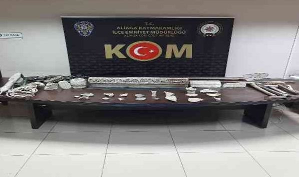 aliağa İlçe Emniyet Müdürlüğü Kaçakçılık ve Organize Suçlarla Mücadele (KOM) Grup Amirliği ekipleri, Bergama ilçesi Talatpaşa Mahallesi ve İnkilap Mahallesi'nde bulunan ikametlerde kaçak kazı yapıldığı bilgisi üzerine harekete geçti. Polis, iki ayrı adrese düzenlediği baskında M.A.Ş. ve H.H.'nin kaçak kazı yaptığını tespit etti. Kazı bölgelerinde yapılan aramada 17 adet kırık çömlek parçası, 1 adet kırılmış cam obje, 1 adet bronz olduğu değerlendirilen obje, 1 adet Roma dönemine ait yazıtlı mermer sütun, 1 adet mezar başlığı, 4 adet mermer sütun ile kazıda kullanılan 2 adet kürek, 1 adet urgan, 1 adet çekiç, 1 adet balyoz, 2 adet kornit başlığı ve 1 adet Roma dönemine ait olduğu değerlendirilen üzerinde figürler bulunan sütun tanbur ele geçirildi. Gözaltına alınan M.A.Ş. ve H.H.'nın emniyetteki işlemleri sürüyor.