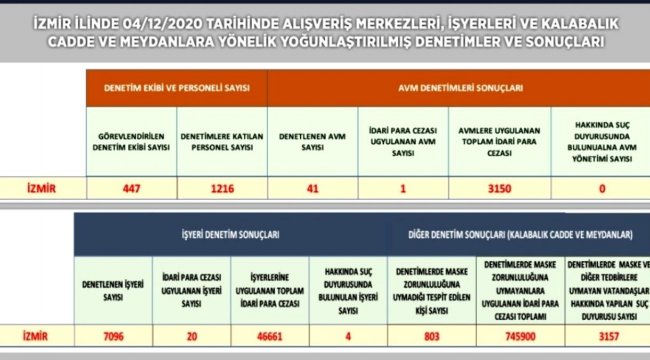 İzmir Valiliğinin sosyal medya hesabında yapılan açıklamaya göre, korona virüs denetimleri kapsamında alışveriş merkezleri, iş yerleri ile kalabalık cadde ve meydanlarda yapılan denetimlerde 795 bin 711 lira idari para cezası kesildiği açıklandı. İzmir Valiliğinin sosyal medya hesabından, kent genelinde bulunan alışveriş merkezleri, iş yerleri ile kalabalık cadde ve meydanlarda korona virüs denetimlerinin gerçekleştirildiğine dair paylaşımda bulundu. 447 denetim ekibi ve 1216 personelin katılımı ile gerçekleşen denetimlerde, 41 alışveriş merkezinden birine 3 bin 150 lira idari para cezası uygulandı. Toplamda 7 bin 96 iş yerinden 20 iş yerine 46 bin 661 lira idari para cezası kesilirken, 4 iş yeri sahibi hakkında da suç duyurusunda bulunulduğu açıklandı. Ayrıca, gerçekleştirilen denetimlerde maske takma zorunluluğuna uymayan 803 kişiye ise, 745 bin 900 lira idari para cezası uygulanırken, maske ve diğer tedbirlere uymayan 3 bin 157 vatandaş hakkında ise suç duyurusunda bulunulduğu bildirildi.