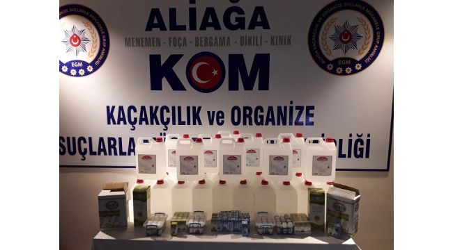 Bergama ilçesinde, sahte alkollü içkilerin satış ve sevkiyatını önlemek amacıyla Aliağa Kom Grup Amirliğin Ekipleri Bergama’da bir iş yerinde kaçak etil alkol ve anason yağı satışı yapıldığı gerekçesiyle iş yerine operasyon yaptı. Ekiplerin yaptığı aramada ,5 litrelik plastik bidonlarda toplam 200 litre etil alkol, 45 şişe 200 mililitrelik anason yağı, 31 adet 20 mililitrelik şişelerde anason aroması, 2 kutu 1 kg'lık anason aroması, 12 kutu 250 mililitrelik anason aroması, 22 adet 20 mililitrelik şişelerde anason aroması, beyaz pet şişe içerisinde 500 mililitrelik viski aroması ele geçirildi.