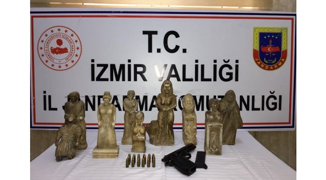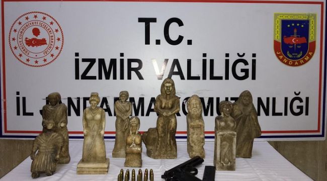 İzmir İl Jandarma Komutanlığı ekipleri, Çeşme ilçesi Altınkum Mahallesi'nde N.K. isimli şahsın 34 YL 8110 plakalı araç ile tarihi eser taşıyarak satacağı bilgisi üzerine harekete geçti. İl Jandarma Komutanlığı Kaçakçılık ve Organize Suçlarla Şube Müdürlüğü ile Çeşme İlçe Jandarma Komutanlığı ekipleri, bahse konu şüpheli aracı adreste durdurdu. Araçta yapılan aramada boyları 10 ila 15 santimetre arasında değişen 9 adet mermer heykel, 1 adet ruhsatsız tabanca, tabancaya ait şarjör ve 20 adet fişek ele geçirildi. Şüpheli N.K. ile araçta bulunan N.Ç. ve R.M.K. gözaltına alındı. Gözaltına alınan şüphelilerin adli işlemlerinin sürdüğü öğrenildi.