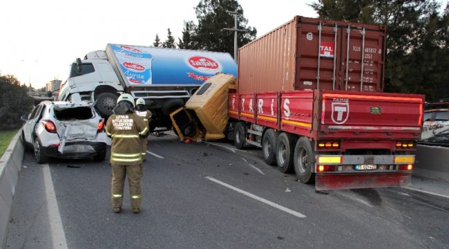 İzmir'in Bornova ilçesinde 1 tır, 1 kamyon ve 2 otomobilin karıştığı zincirleme kazada 1'i ağır 6 kişi yaralandı.