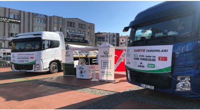 Hayrat İnsani Yardım Derneği İzmir Temsilciliği, hayırseverlerce yapılan bağışlarla temin edilen 2 tır dolusu gıda yardımını Suriye'nin İdlib kentine gönderdi. Aliağa ilçesi Demokrasi Meydanı'ndan 500 çuval un ve temel gıda malzemelerinin bulunduğu 1000 erzak paketinin yer aldığı 2 tır dolusu yardım malzemesi, dualarla Suriye'deki çadır kentlere gönderildi. Dernekten yapılan açıklamada, yardımların dağıtımına Hayrat Yardım İzmir Temsilciliğinden görevlilerin refakat edeceği belirtildi.