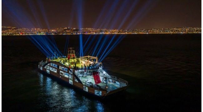 Sosyal mesafe kuralı gereği Levent konsere orkestrayla değil üç müzisyenle çıktı. Ses ve ışık sistemiyle donatılmış feribot aynı zamanda Körfez’de büyük bir görsel şölen de yarattı.