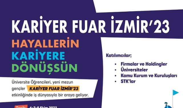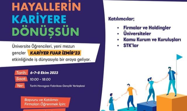 İzmir Büyükşehir Belediyesi Sosyal Projeler Dairesi Başkanlığı Gençlik Çalışmaları ve Sosyal Projeler Şube Müdürlüğü koordinasyonunda 6-8 Ekim 2023 tarihlerinde Alsancak Tarihi Havagazı Fabrikası Gençlik Yerleşkesi’nde “Kariyer Fuar İzmir’23” etkinliği yapılacak. “Hayallerin Kariyere Dönüşsün” sloganıyla nitelikli işgücü ile iş dünyasını buluşturacak Kariyer Fuarı, İzmir’de yaşayan 18-35 yaş arası üniversite öğrencisi ve mezunu genç grubuna sesleniyor. Fuar 10.00 – 18.00 saatleri arasında ücretsiz ziyaret edilebilecek. Başvuru ve katılımcı firmaları görmek için gencizmir.com adresi ziyaret edilebilir. Nitelikli işgücü ile buluşma fırsatı