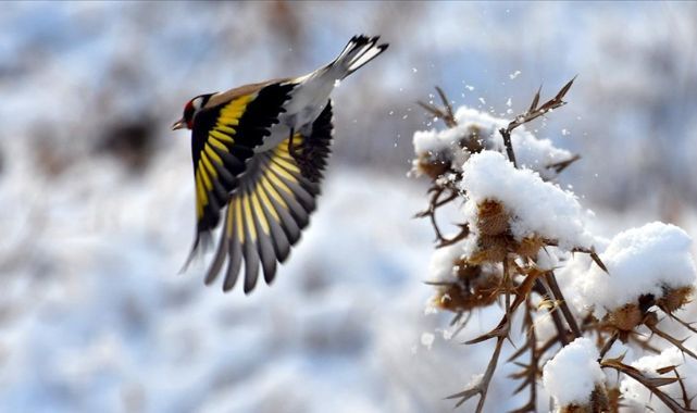 Güzel kar manzaralarının oluştuğu sarıçam ormanlarında saka kuşları, bitki tomurcuklarıyla beslenmeye çalıştı.