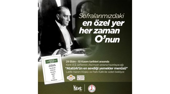 Karşıyaka Belediyesi iştirâki Kent A.Ş, Ulu Önder Gazi Mustafa Kemal Atatürk’ün aramızdan ayrılışının 81. yılı anısına özel bir menü hazırladı. Ata’nın en sevdiği yemeklerden oluşan menü, Latife Hanım Köşkü Kafe ve Park Kafe’de konukların beğenisine sunuldu.