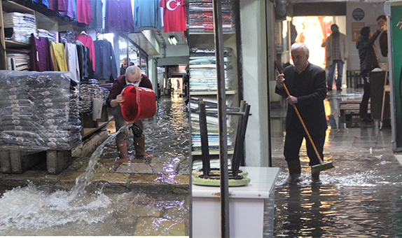 İzmir’de sabah saatlerinden itibaren etkisini gösteren şiddetli sağanak yağış sebebiyle Tarihi Kemeraltı Çarşısı’nın bazı sokak ve dükkanları yağmur sularıyla doldu. Esnaf, ellerine aldığı kova ve küreklerle yağmur sularını tahliye etmeye çalıştı.