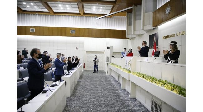 Konak Belediye Başkanı Abdül Batur, meclis oturumunun başında yaptığı konuşmada, belediyenin salgının başlangıcından bugüne yaptığı çalışmaları aktardı. Covid-19 sebebiyle vefat eden vatandaşların yakınlarına başsağlığı dileklerini ileten Başkan Batur, tedavileri süren hastalara da acil şifalar diledi. Devletin her kademesinin ve yerel yönetimlerin bu süreçte üzerlerine düşen görevleri yerine getirdiklerini ve herkesin çalıştığını vurgulayan Batur, özellikle sağlık çalışanlarına minnet duyduklarını ifade etti. Batur, meclis üyelerini, salgın sırasında çalışanlar için bir dakikalık alkışa davet ederek, “Bu süreçte vatandaşın aldığı tedbirin yanı sıra sağlık çalışanlarının cansiperane çalışmaları çok önemli. Doktorundan hastabakıcısına tüm sağlık çalışanlarına teşekkür ediyoruz. Onların hakkı ödenmez. Sağlık çalışanlarımızı biz, üç gün saat 9.00’da balkonda alkışlamıştık. Şimdi başta sağlık çalışanları olmak üzere sahada çalışan tüm meslek gruplarını bir dakika alkışlamamızı rica ediyorum” dedi. Başkan Batur’un daveti üzerine meclis üyeleri sağlık çalışanları başta olmak üzere salgın sırasında çalışan tüm meslek gruplarını bir dakika boyunca ayakta alkışladı.