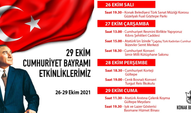 Konaklılar, Cumhuriyet Kortejinin ardından, bayram kutlamalarına Cenk Bosnalı’nın sahne alacağı konserle devam edecek. Cumhuriyet Bayramı coşkusu, 28 Ekim gecesi Konak Gültepe’den ezgilerle yayılacak. 29 Ekim günü ise Cumhuriyet Bayramı kutlamaları Gültepe Meydanı’ndaki Atatürk Anıtı’na çelenk bırakılması ile taçlanacak. Öte yandan Konak Belediyesi’nin Basmane’deki ana hizmet binası da Cumhuriyet Bayramı için ışıklandırılacak ve özel ışık ve lazer gösterisi yapılacak.
