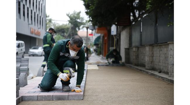 Konak Belediyesi, salgın nedeniyle sokaklardaki trafik ve insan yoğunluğunun azaldığı ilçede yol, kaldırım, merdiven yenileme çalışmalarına hız kesmeden devam ediyor.