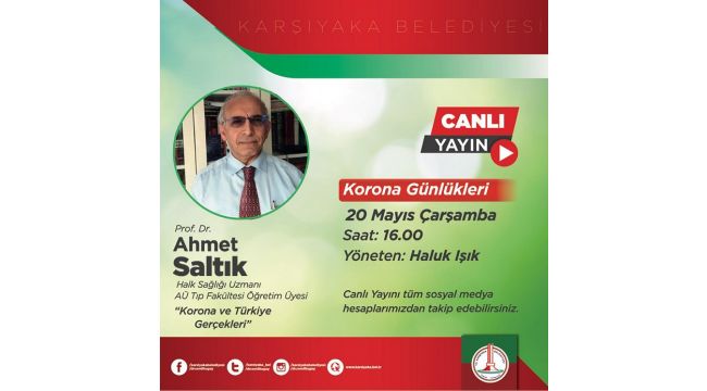 Karşıyaka Belediyesi tarafından düzenlenen “Ayın Konuğu” etkinliklerinin, koronavirüs salgını nedeniyle ertelenmesi sonucu, “Korona Günlükleri” adıyla internet üstünden sürdürülen söyleşiler, 20 Mayıs Çarşamba günü çok önemli bir konuğu ağırlayacak. Küresel salgının ilk günlerinden bugüne, yaptığı öngörü, uyarı ve önerileriyle dikkat çeken, ömrünü kamu sağlığına ve Türkiye’nin geleceğine adayan Prof. Dr. Ahmet Saltık, ilk kez bir yerel yönetimin canlı yayınında yer alacak. Haluk Işık’ın yöneteceği, 20 Mayıs Çarşamba saat 16.00’da başlayacak ve Karşıyaka Belediyesi’nin resmi sosyal medya hesaplarından canlı olarak izlenecek etkinlikte, “Korona ve Türkiye Gerçekleri” konuşulacak.