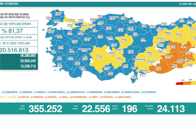 Sağlık Bakanlığı, son 24 saatlik korona virüs tablosunu açıkladı. Türkiye'de son 24 saatte 22.556 kişinin testi pozitif çıktı, 196 kişi hayatını kaybetti.1 Aralık’ta açıklanan 24 saatlik verilere göre, 22 bin 556 tespit edildi. Virüs nedeniyle hayatını kaybedenlerin sayısı 196 oldu. Bir günde toplam 355 bin 252 test yapılırken, iyileşen hasta sayısı 24 bin 113 olarak kaydedildi. Sağlık Bakanlığı tarafından açıklanan tabloda, 2 doz aşılama verilerine de yer verildi. En az 2 doz aşı olmuş 18 yaş üzeri nüfusu kapsayan verilere göre Türkiye'de 2. doz aşılama ortalama yüzde 81,37 oldu. 1. doz ortalaması yüzde 90,69 olurken, 1., 2. ve 3. doz aşısını olan vatandaş sayısı toplamda 120 milyon 516 bin 813’e yükseldi.