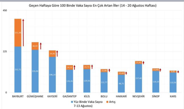 Vaka sayıları bir önceki haftaya göre en çok artan 10 ilin Bayburt, Gümüşhane, Kayseri, Gaziantep, Kilis, Bolu, Hakkari, Nevşehir, Sinop ve Kars olduğunu bildiren Koca, "Bu şehirlerden birindeyseniz, öncesine göre daha az güvendesiniz." değerlendirmesini yaptı.