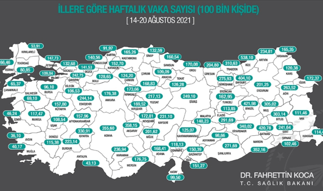 Sağlık Bakanı Fahrettin Koca, sosyal medya hesabından il bazında 14-20 Ağustos'ta her 100 bin kişide görülen Kovid-19 vaka sayılarının yer aldığı haritayı paylaştı.