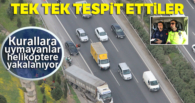 İzmir Emniyetine bağlı Bölge Trafik Denetleme Şube Müdürlüğü ve Havacılık Şube Müdürlüğüne bağlı ekipler, kentin çeşitli noktalarda trafiği helikopterle denetleyerek kurallara uymayan sürücüleri tespit etti.