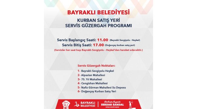 Kurban Bayramı dolayısıyla çalışmalarını hızlandıran Bayraklı Belediyesi ekipleri, vatandaşların Doğançay'daki kurban kesim ve satış yerine rahat ulaşması için ücretsiz servis hizmeti veriyor. Her gün 11:00-17:00 arası, saat başlarında Sevgiyolu heykelden hareket eden servisler vatandaşları ücretsiz taşıyor. İlk servis saat 11:00'da Bayraklı Sevgi Yolu Heykel önünden hareket ediyor. Son servis ise 17:00'da Doğançay Kurban Satış Yeri'nden kalkıyor. Bayramın ilk günü sona erecek uygulamada, servis güzergahları ise şu şekilde: Bayraklı Sevgiyolu Heykel, Alpaslan Mahallesi, 75. Yıl Mahallesi, Cengizhan Mahallesi, Nafiz Gürman Mahallesi Su Deposu, Doğançay Kurban Satış Yeri.