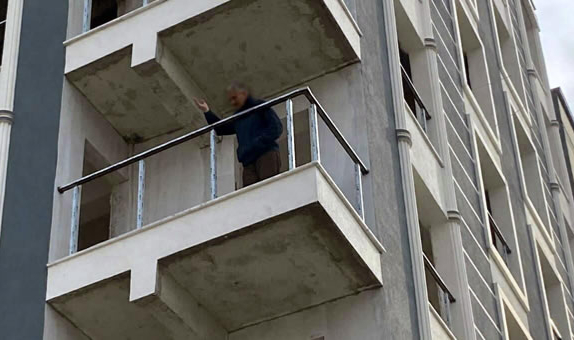 Sümer Mahallesi, Hürriyet Caddesi’ndeki yedi katlı bir apartman inşaatında asgari ücretle bekçi olarak çalışan Yılmaz P., bugün öğle saatlerinde, ikinci kat balkonuna çıkarak, ‘Ölmek istiyorum’ diye bağırmaya başladı. Çevredekilerin ihbarı üzerine olay yerine polis, 112 Acil Servis ve itfaiye ekipleri sevk edildi. 4 aydır maaşını alamadığını, müteahhit Mehmet Ç.’ye (55) de ulaşamadığını ileri süren Yılmaz P., kimseyi yanına yaklaştırmadı. Sık sık balkonun korkuluklarına kadar yaklaşıp, atlayacağını söyleyen Yılmaz P., polislere direndi. Polis ekipleri, müteahhit ile görüşüp, kendisine her türlü desteği vereceklerini belirterek Yılmaz P.’yi ikna edip bulunduğu yerden indirildi. İnşaatın önünde hazır bekletilen ambulansa alınarak sakinleştirilen Yılmaz P., daha sonra ifadesine başvurulmak üzere polis merkezine götürüldü.