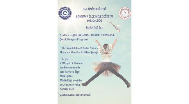 Ege Üniversitesi Atatürk Sağlık Hizmetleri Meslek Yüksekokulu Çocuk Gelişim Programı öğrencileri “Masallardaki Bilim Şenliği’’ temasıyla miniklerin eğlenceli zaman geçirmelerini sağlamak amacıyla hikâyeleri ve masalları bilimle birleştiriyor. EÜ Atatürk Sağlık Hizmetleri Meslek Yüksekokulu Çocuk Gelişim Programı öğrencileri tarafından hazırlanan videolar; Ege Üniversitesi ve Bornova İlçe Milli Eğitim Müdürlüğü işbirliği ile Bornova Milli Eğitim Müdürlüğü YouTube sayfasından, 27 Mayıs 2020 tarihinden itibaren 12 gün boyunca izlenebilecek.