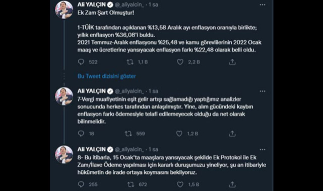 Memur Sen Genel Başkanı Yalçın, Twitter hesabından yaptığı açıklamada,Türkiye İstatistik Kurumu'nca (TÜİK) açıklanan enflasyon rakamlarını değerlendirdi. Yalçın, TÜİK tarafından açıklanan yüzde 13,58 aralık ayı enflasyon oranıyla birlikte yıllık enflasyonun yüzde 36,08'i bulduğunu belirterek, "2021 Temmuz-Aralık enflasyonu yüzde 25,48 ve kamu görevlilerinin 2022 Ocak maaş ve ücretlerine yansıyacak enflasyon farkı yüzde 22,48 olarak belli oldu. Kısacası aralık ayı enflasyon rakamları göstermektedir ki 'hedefler tutmadı, tahminler şaştı'. Covid-19 pandemisinin de etkisiyle küresel ve bölgesel ekonomide yaşanan hareketlilik, enflasyonu yukarı yönlü, alım gücünü ise aşağı yönlü hareket ettirmeye devam ediyor. Mutabakatsızlıkla sonuçlanan ve Kamu Görevlileri Hakem Kurulu kararı ile 2021 için yüzde 3+3 oranındaki artışlar; enflasyona sadece yenilmedi, ezildi. Enflasyon farkı memurun düşen alım gücünü yükseltmek için asla yeterli değildir. Şimdi kamu görevlilerinin alım gücünü yükseltme zamanıdır" dedi.'KAYIPLAR TELAFİ EDİLMELİ'Yalçın, 1 Eylül-31 Aralık tarihleri arasında ekonomide yaşanan dalgalanmalar sonucu kur ve enflasyonun arttığını, maaşların erimeye, gelir dağılımında adaletsizliğin büyümeye devam ettiğini belirterek, şunları kaydetti:"Nitekim buna bağlı olarak yeni yılla birlikte, zamlar da peş peşe gelmeye devam ediyor. Yeni yılla birlikte; doğal gaza, elektriğe, benzine, motorine, MTV ve ÖTV'ye, harçlara, vergilere, toplu taşımaya ve bunun yanında gıda ürünlerine azımsanmayacak oranda zam yapıldı. Bu gerçekler görülmeli, 'ek protokol' ile ilave ödeme yapılarak kayıplar telafi edilmelidir. Asgari ücrete yapılan yüzde 50 zam sahada memnuniyet üretmişken, aynı zorluklarla geçim mücadelesi veren kamu görevlileri ve emeklileri görmezden gelinemez, vergi muafiyetinin 'yeterli zam' olarak gösterilmeye çalışılması da kabul edilemez. Vergi muafiyetinin eşit gelir artışı sağlamadığı yaptığımız analizler sonucunda herkes tarafından anlaşılmıştır. Yine, alım gücündeki kaybın enflasyon farkı ödemesiyle telafi edilemeyecek olduğu da net olarak bilinmelidir. Bu itibarla, 15 Ocak'ta maaşlara yansıyacak şekilde ek protokol ile ek zam-ilave ödeme yapılması için kararlı duruşumuzu yineliyor, şu an itibarıyla hükümetin de irade ortaya koymasını bekliyoruz. Ek zam şart olmuştur."