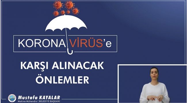 Belediyenin ve belediye başkanı Mustafa Kayalar’ın sosyal medya hesaplarından yayınlanan videoda görme engelliler için sesli, işitme engelliler için de görsel şekilde özel video hazırlandı. Video içeriğinde 9 maddede koronavirüse karşı alınacak önlemler anlatıldı.