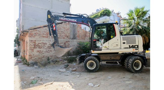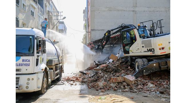 buca Belediyesi Fen İşleri ekipleri, İnkılap Mahallesi 515 Sokak'ta bulunan madde bağımlıların mesken tuttuğu ve uzun süredir kullanılmadığı için çöplüğe dönen metruk binayı yıktı.