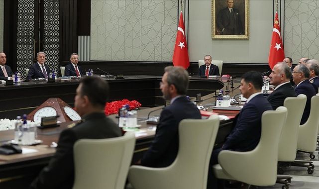 Cumhurbaşkanlığı Külliyesi'nde yapılan MGK toplantısının ardından bildiri yayımlandı.Bildiride, toplantıda, terör örgütleri PKK/KCK, PYD/YPG, FETÖ ve DEAŞ başta olmak üzere milli birlik ve beraberlik ile bekaya yönelik her türlü tehdit ve tehlikeye karşı yurt içinde ve yurt dışında azim, kararlılık ve başarıyla icra edilen operasyonlar hakkında Kurul'a bilgi sunulduğu ve ilave tedbirlerin görüşüldüğü belirtildi.Türkiye'nin güney sınırlarında icra edilen operasyonların tek hedefinin terör örgütleri olduğu aktarılan bildiride, şunlar kaydedildi:"Yüce milletimizin ve eşsiz ülkemizin savunmasını ve güvenliğini sağlamak maksadıyla BM Şartı'nın 51. Maddesi kapsamında güney sınırlarımız boyunca icra edilen operasyonların tek hedefinin terör örgütleri olduğu, bölgemizde, sınırlarımızı, şehirlerimizi, vatandaşlarımızı ve güvenlik güçlerimizi hedef alan hiçbir terör örgütünün varlığına ve etkinliğine müsaade edilmeyeceği, bunun için gereken her adımın kararlılıkla atılacağı hususu vurgulanmıştır.Teröre karşı verdikleri kahramanca mücadelede, milli ve milletlerarası hukuk ile insan hakları ve kamu vicdanına mutlak bir bağlılıkla hareket etmeyi ilke olarak benimseyen güvenlik kuvvetlerimizin, ağır darbe alan bölücü terör örgütüne nefes aldırmak maksadıyla yalan ve iftiraya başvuran çevrelerce hedef alınmasına hiçbir surette müsamaha gösterilmeyeceğinin altı çizilmiştir."