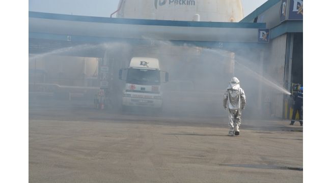 İtfaiye Haftası etkinlikleri kapsamında İzmir Büyükşehir Belediyesi İtfaiyesi Kuzey Bölge Amirliği, Paşa Çiftliği mevkiinde bulunan bir dolum tesisinin işçileri ile ortak yangın tatbikatı yaptı. Tatbikat, senaryo gereğince, dolum tesisindeki peronda bir tankerin dolum yaptığı esnada gaz kaçağı oluşması sonucu çıkan olası yangın ile başladı. Yangın alarmının verilmesinin ardından yangın söndürme sistemi anında devreye girdi. 22 kişilik dolum tesisi yangına müdahale ekipleri, Aliağa Dolum Tesis Müdürü Bedri Kaçar öncülüğünde ilk müdahaleyi yaptı. Yanmaz kumaş giydirilmiş ekip tarafından peronda gaz vanası kapatıldı. İlk müdahaleyi tesis çalışanlarının yaptığı yangın mahalline, son teknoloji sistemle donanımlı İzmir Büyükşehir itfaiye araçları 4 dakika içerisinde geldi. Ekipler, baygın halde bulunan sürücüyü araçtan çıkartarak AKS aracı ile hastaneye gönderdi. Yaklaşık 15 dakika süren kimyasal yangına müdahale başarı ile tamamlandı.