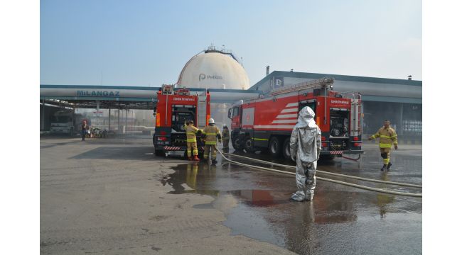 İzmir Büyükşehir Belediyesi İtfaiyesi Kuzey Bölge Amiri Kerim Köse de, "Sanayi kenti Aliağa’da en çok çıkması muhtemel kimyasal yangınlara karşı hem sanayi kuruluşlarının bilinçlendirilmesi hem de itfaiye haftası etkinlikleri kapsamında gerçeğini aratmayacak bir tatbikat yaptık. Milangaz Dolum Tesislerindeki yangın tatbikatına 4 araç ve 15 personel ile müdahale ettik. Toplam 37 kişilik bir ekiple gerçekleştirilen tatbikat başarı ile tamamlandı" şeklinde konuştu.