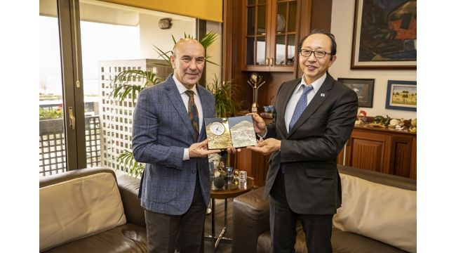 Nishimaki İzmir Büyükşehir Belediye Başkanı Tunç Soyer’e masa saati ve takvim hediye ederken, Tunç Soyer de Nishimaki’ya saat kulesi işlemeli plaket hediye etti.
