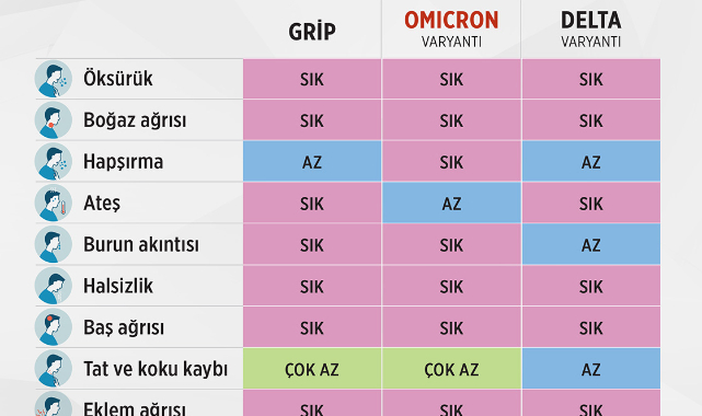 Son günlerde Kovid-19'un Delta varyantının yanı sıra Omicron varyantı İstanbul başta olmak üzere ülke genelinde vaka artışlarına sebep oldu.Ayrıca tüm Türkiye'de mevsimsel grip vakalarında da artış yaşandı. Bu durum, akıllara bu hastalıkların semptomları arasındaki fark ve benzerliklerin neler olduğu sorusunu getirdi.Ankara Şehir Hastanesi Acil Tıp Kliniği Eğitim Sorumlusu Prof. Dr. Hakan Oğuztürk, üç hastalığın semptomlarının neler olduğu ve hangi sıklıkla görüldüğüne ilişkin AA muhabirine açıklamada bulundu.Gribin sık görülen belirtilerinin öksürük, boğaz ağrısı, ateş, burun akıntısı, halsizlik, baş ağrısı, eklem ağrısı ve nefes darlığı olduğunu aktaran Oğuztürk, hapşırığın az görülen, koku ve tat kaybının ise çok az görülen belirtilerden olduğunu ifade etti.Prof. Dr. Oğuztürk, Omicron varyantının sık görülen semptomlarının başında da öksürük, boğaz ağrısı, hapşırık, burun akıntısı, halsizlik, baş ağrısı, eklem ağrısı ve nefes darlığının geldiğini, ateşin az görülen, koku ve tat kaybının ise çok az görülen belirtilerinden olduğunu kaydetti.Delta varyantında ise öksürük, boğaz ağrısı, ateş, halsizlik, baş ağrısı, eklem ağrısı, nefes darlığı şikayetlerinin sık görüldüğüne dikkati çeken Oğuztürk, hapşırık, burun akıntısı ile koku ve tat kaybının az görülen semptomlardan olduğunu aktardı."Şikayetler başladığı andan itibaren PCR testi yaptırılması çok önemli"