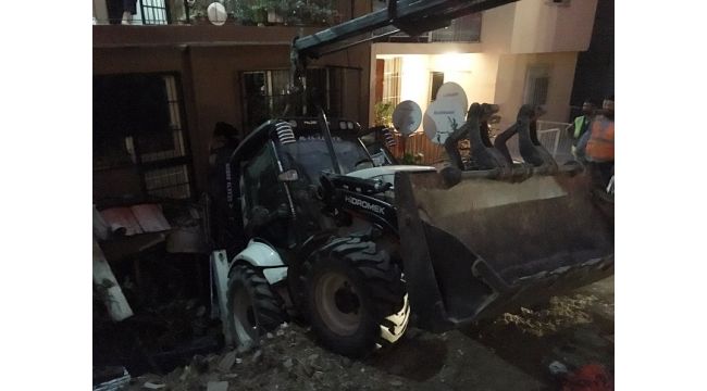 İZMİR (İHA) - İzmir’in Karabağlar ilçesinde park halindeki kepçe, bir anda kayarak binaya daldı. İki dairede hasar meydana geldi.