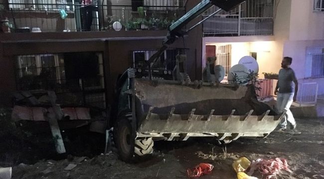 Olay, saat 18.30 sularında Karabağlar 3243. Sokak'ta meydana geldi. İddiaya göre, iki gündür mahallede doğalgaz çalışması yapan ekiplere ait kepçe, park halindeyken bir anda kayarak 5 katlı binaya daldı. Gürültüyü duyan mahalleli gördüğü manzara karşısında şoke olurken, durumu hemen polise haber verdi. Olay yerine sağlık ekipleri de sevk edilirken, apartman sakinleri büyük panik yaşadı. Çarpmanın etkisiyle apartmanın ilk iki katında bulunan dairelerde maddi zarar meydana gelirken, olayda can kaybı yaşanmadı. Vinç yardımıyla kepçe düştüğü yerden çıkarılırken, olayla ilgili inceleme başlatıldı.